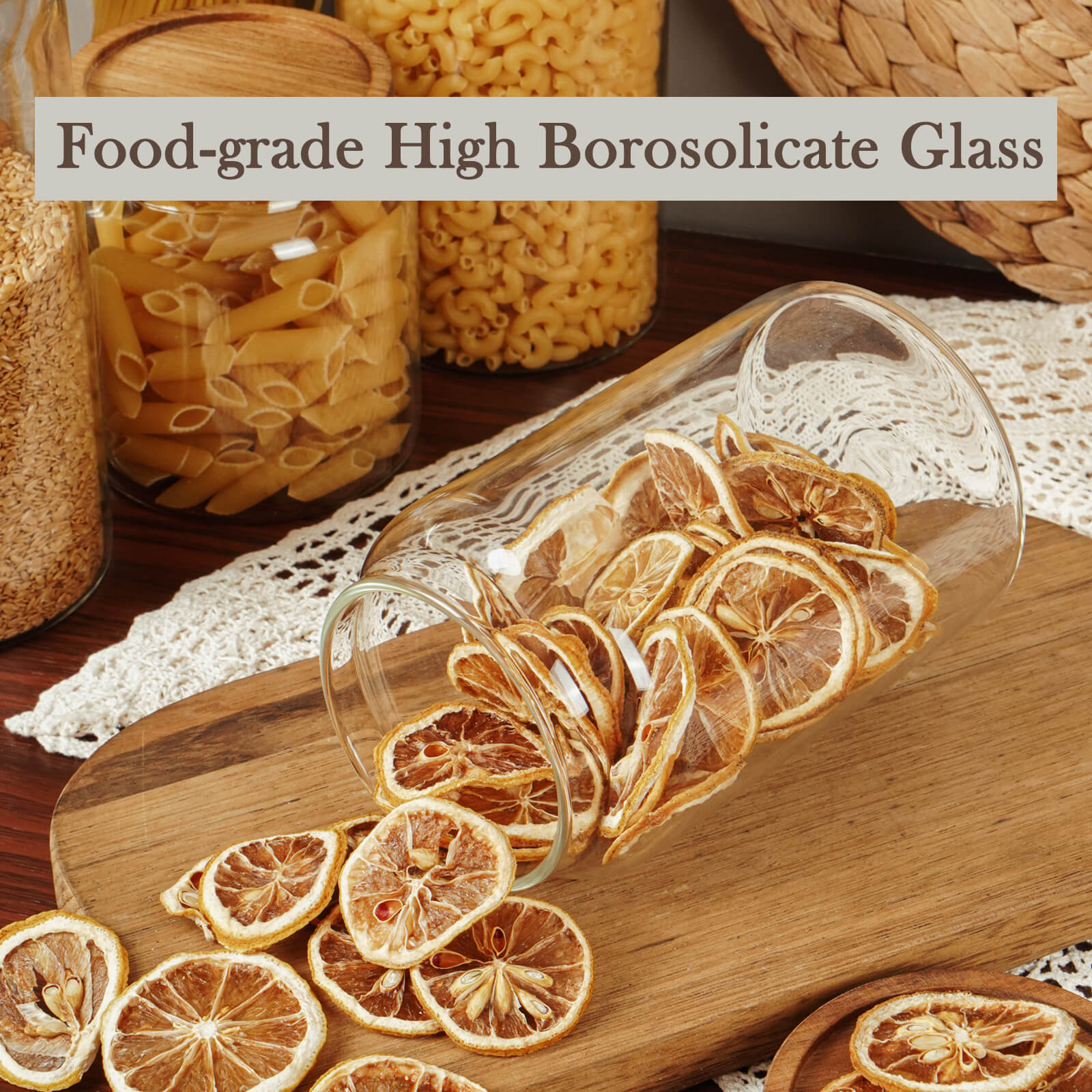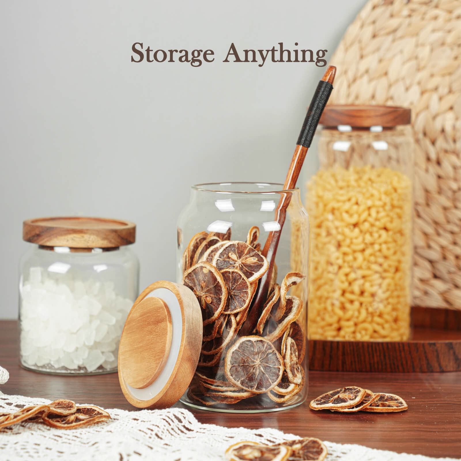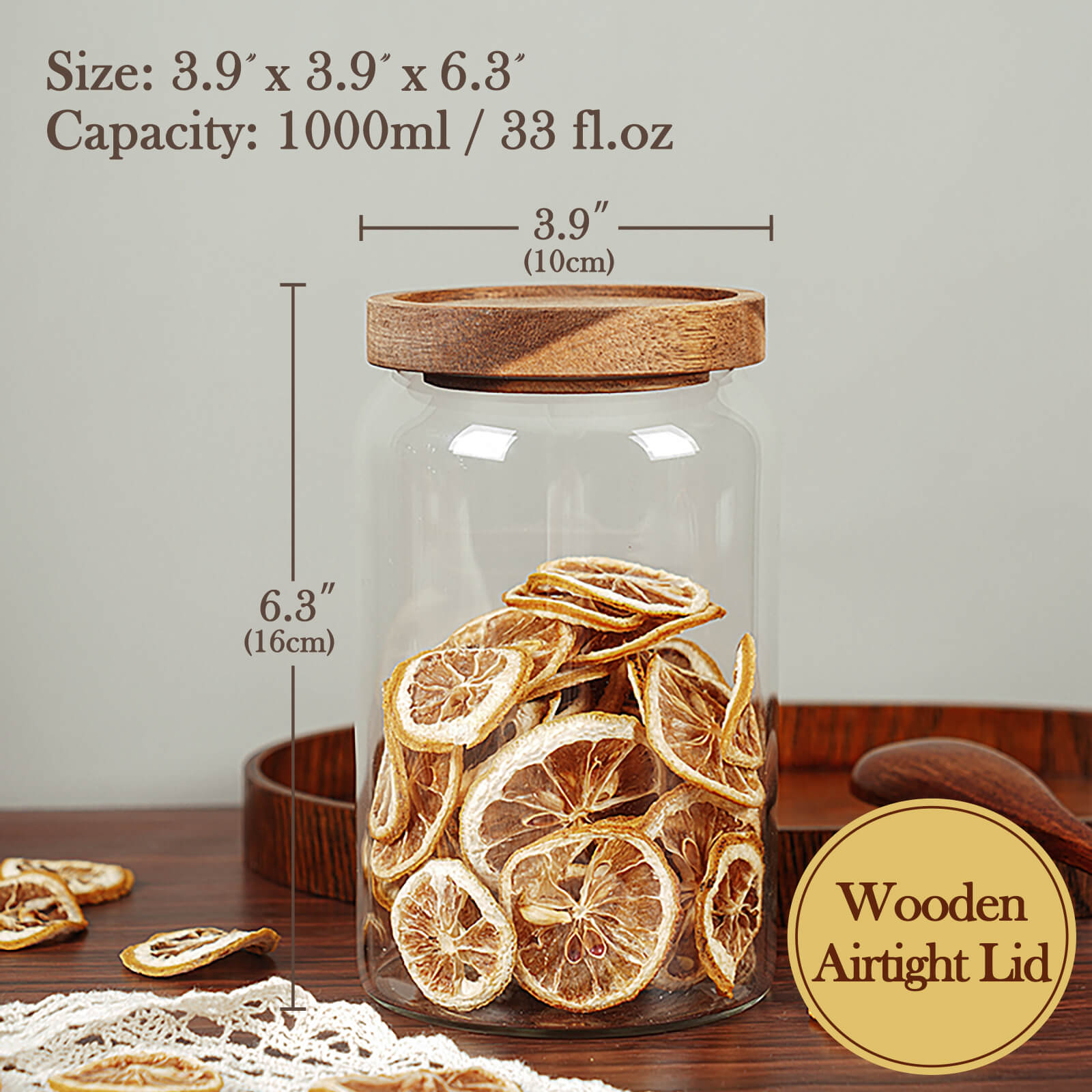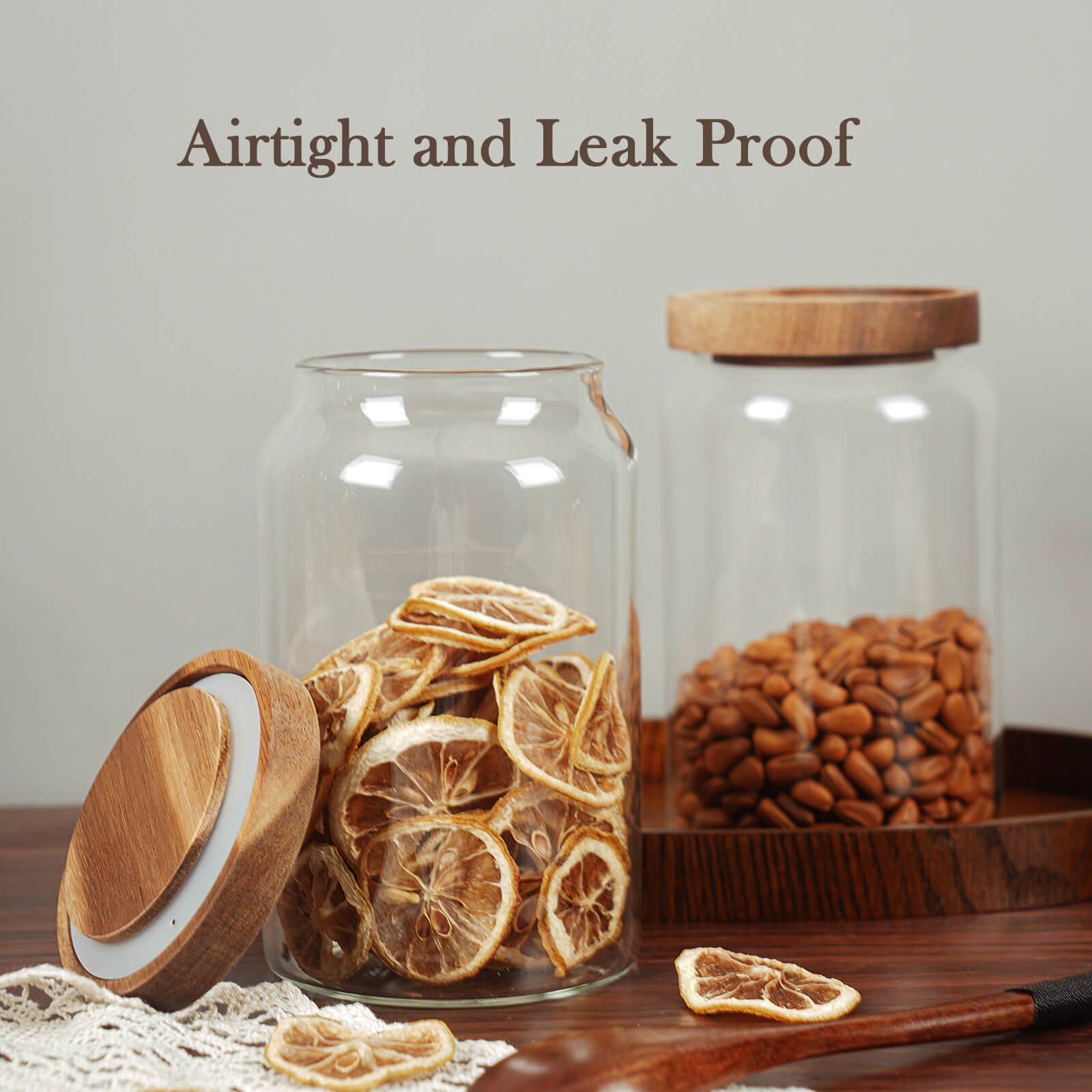 - AIRTIGHT LIDS - The glass kitchen canisters are with an airtight wooden lid, it can seal the content away from humidity and air. Keeps food fresh longer. Glass and wood lidded canister makes a perfect storage and display solution for your home.