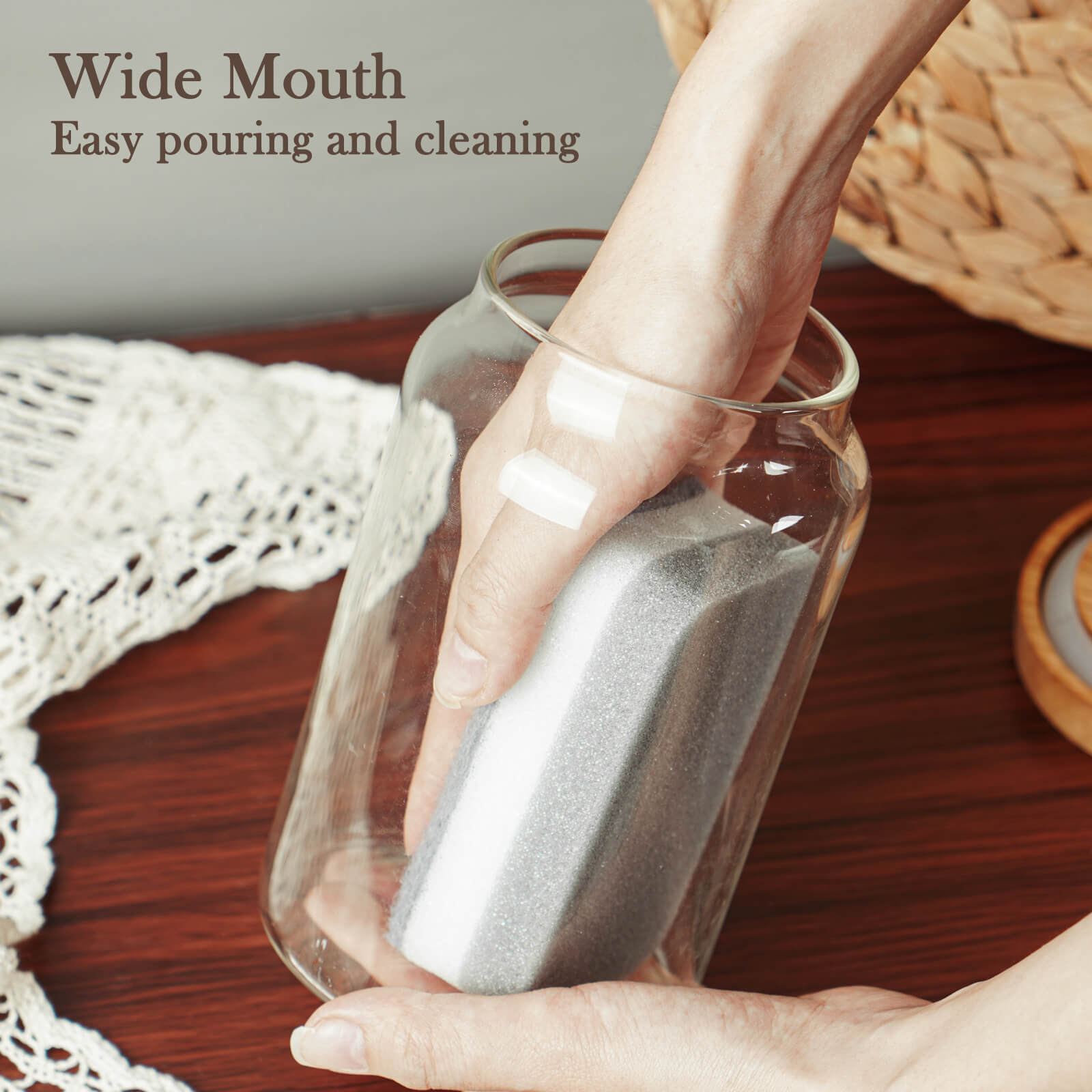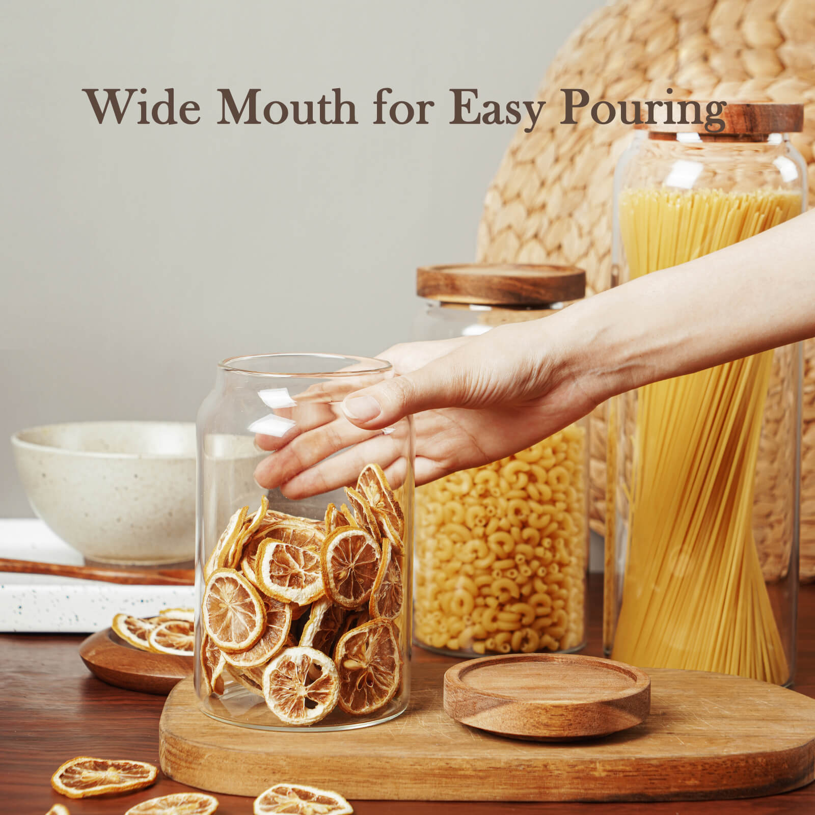 - WIDE OPENING - The glass food storage containers are designed as opening wide for pouring pasta or snacks, and the wide opening also allows a scoop or measuring cup to fit inside. You can easily pouring and cleaning these kitchen canisters.