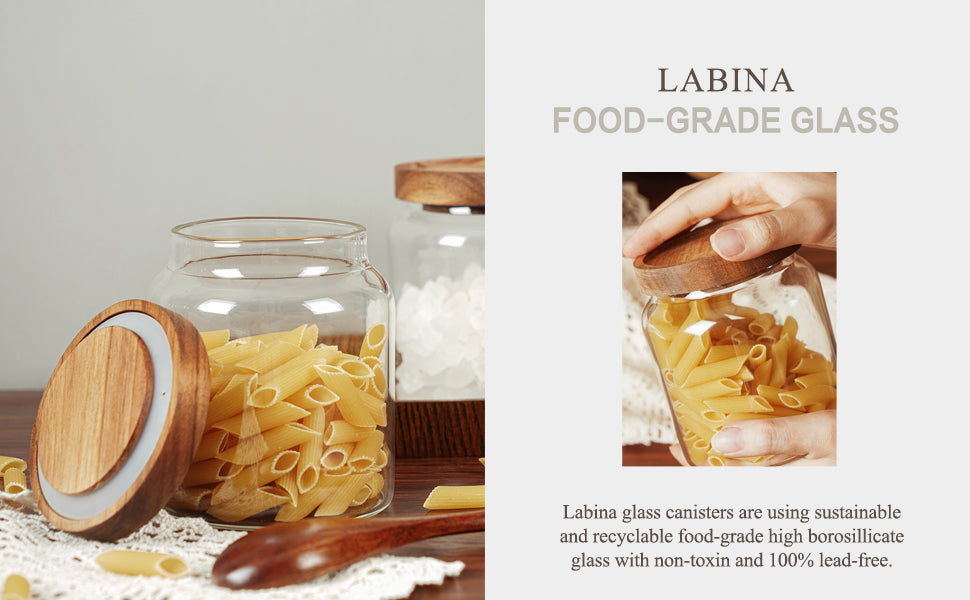 丶MATERIAL SAFE - Our Labina glass canisters are made of food-grade high borosilicate glass, non-toxic, and 100% lead-free. The thickened heavy-duty tempered glass jars are more durable. They are a great way to store food and keep it fresh.