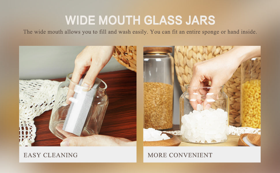 丶WIDE OPENING - The glass food storage containers are designed as opening wide for pouring pasta or snacks, and the wide opening also allows a scoop or measuring cup to fit inside. You can easily pouring and cleaning these kitchen canisters.