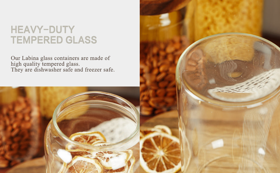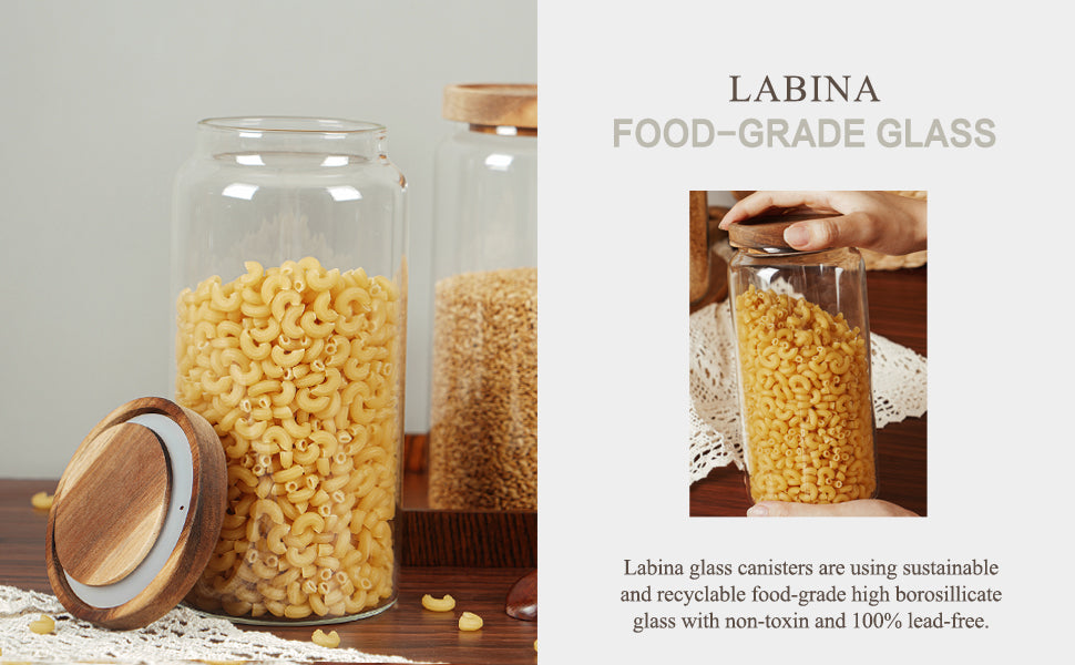 丶MATERIAL SAFE - Our Labina glass canisters are made of food-grade high borosilicate glass, non-toxic, and 100% lead-free. The thickened heavy-duty tempered glass jars are more durable. They are a great way to store food and keep it fresh.