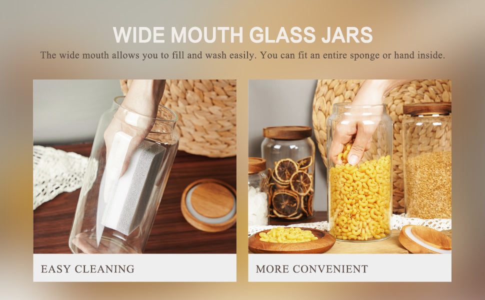 丶WIDE OPENING - The glass food storage containers are designed as opening wide for pouring pasta or snacks, and the wide opening also allows a scoop or measuring cup to fit inside. You can easily pouring and cleaning these kitchen canisters.