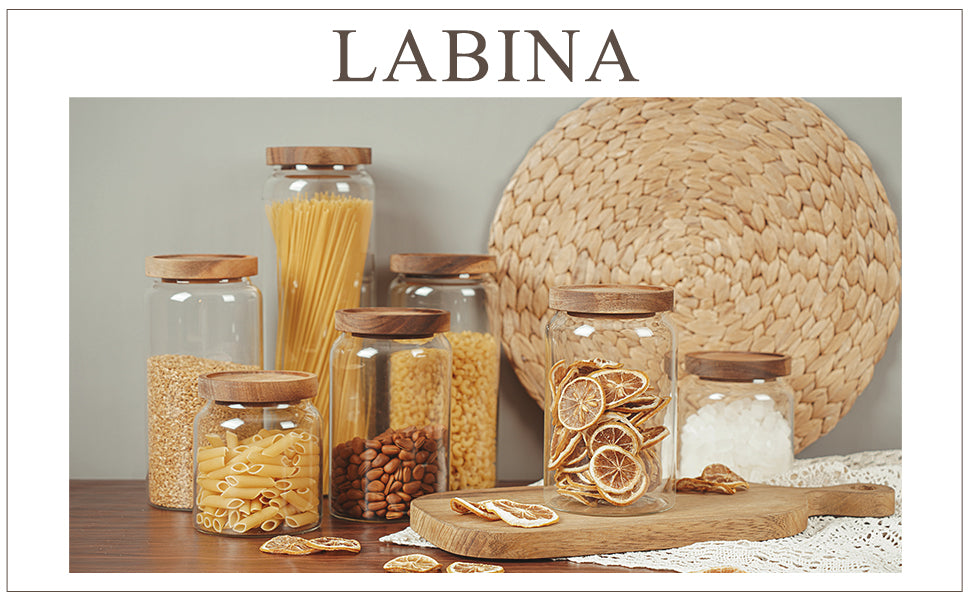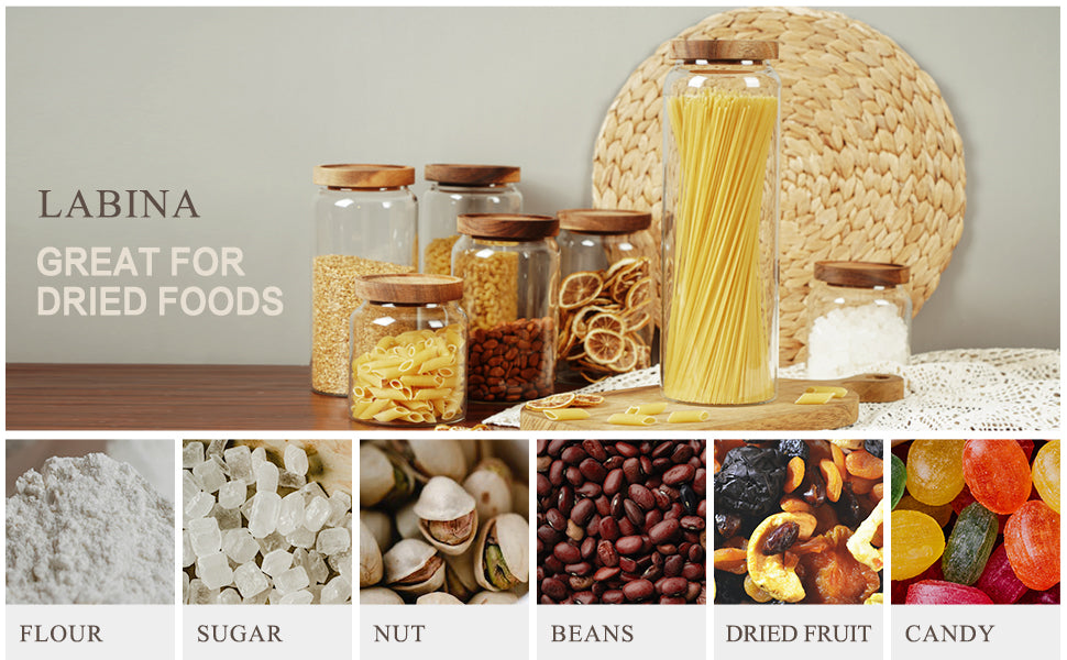 Labina Glass Storage Container Airtight Food Jars Kitchen Canister with Wood Lids, 40 Oz Wide Mouth Pantry Organization Glass Jar for Flour, Sugar, Cookie, Spagetti, Nuts and Candy