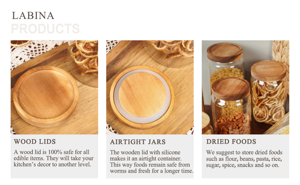 丶AIRTIGHT LIDS - The glass kitchen canisters are with an airtight wooden lid, it can seal the content away from humidity and air. Keeps food fresh longer. Glass and wood lidded canister makes a perfect storage and display solution for your home.